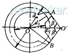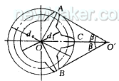 如图4,O′A、O′B为两测量爪,调整β角,使测量爪工作面与齿轮轮齿中线附近齿顶相切,转动读数头旋钮,使伸入端OE顶到齿根圆E点上(跨齿数为偶数),读出OE值,由于