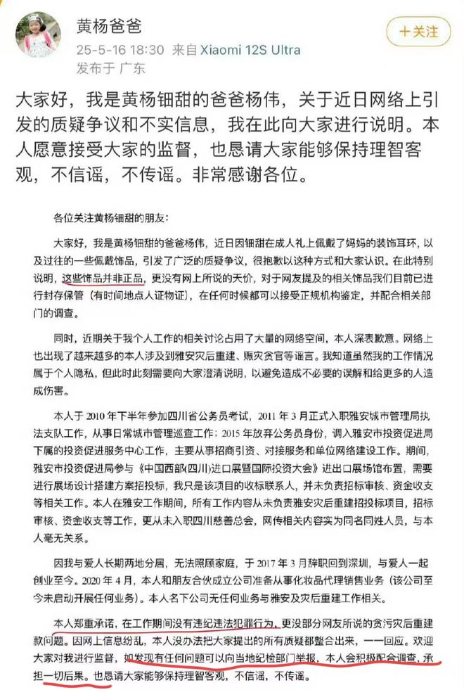 本来当时,黄杨钿甜父亲跳出来信誓旦旦的发文称自己在工作期间从未有过违法犯罪行为,还表示自己会积极配合调查的时候就以为事情差不多到这就要结束了,但是谁也没想到,真正深入调查的时候,这个发言自信十足的人身上还真查出了不少问题。