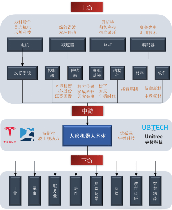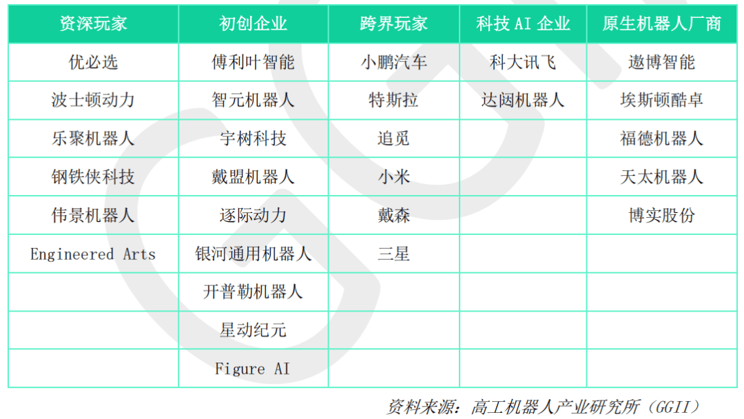 代表企业:优必选(Walker系列)、宇树科技(H1)、智元机器人(远征A1)、傅利叶智能(GR-1)等。