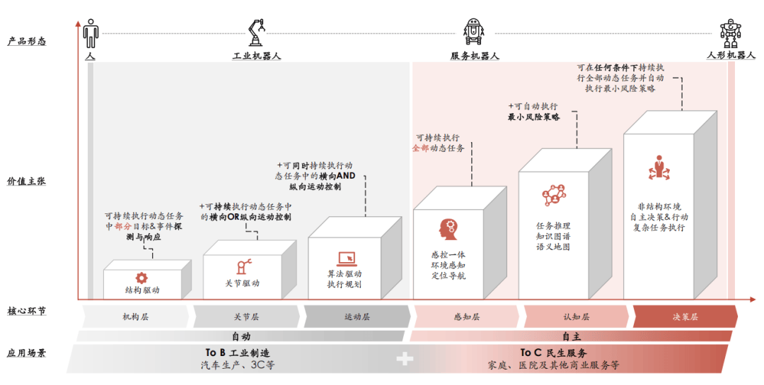 人形机器人主要在工业场景试水,如物流搬运、设备巡检等,因其任务相对重复和单一,对智能程度要求较低。