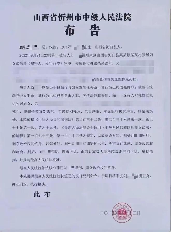 5月13日,一份山西省忻州市中级人民法院的布告在网上流传出来,一位51岁的罪犯刘某某因为犯了罪被执行死刑了。有些网友不明白,怎么还有因为罪被枪毙呢?他是了,还是手段太残忍导致被害人死亡呢?看了这个布告后,网友们评论炸裂,这个刘某某太可恨了,必须判处死刑,不然不足以平民愤。